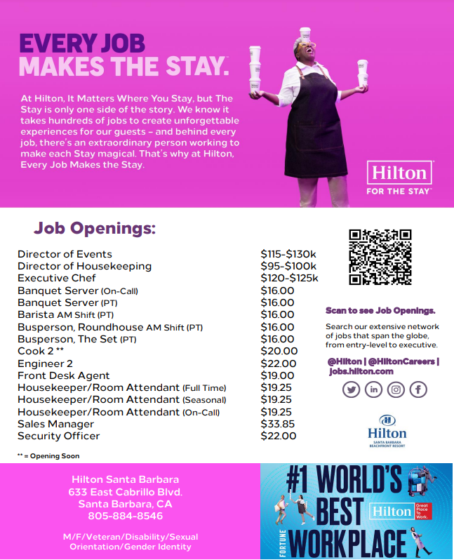 Hospitality: Many hotels are hiring including the Belmond El Encanto, Mar Monte Hotel, Rosewood Miramar Beach, The Inn at East Beach, Haley Hotel, and Hotel Californian. and the Hilton Santa Barbara.